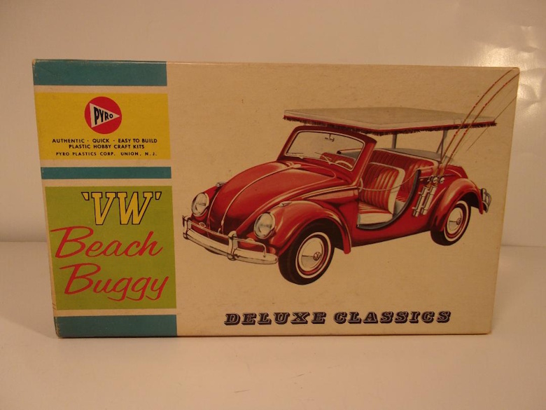 In this instance, I refer to the defunct model manufacturer, Pyro Plastics Corporation, from Union, NJ. From the mid fifties, they offered a few car kits labeled as 1/24 scale, and in the sixties, a prolific range of 1/32 scale vehicles. Herewith is presented a fact or two, and a "guesstimation", that may or may not be totally accurate, but if a detective can gather facts, and from them form a potential conclusion, I too can attempt to establish a correlation and form a hypothesis. In the latter '50s, Pyro offered a Volkswagen sun roof sedan as a 1/24 scale plastic model kit. It had a multi piece body, plastic tires, and no chrome parts, but it was one of, if not the only plastic scale model assembly kit of the Volkswagen at the time. Later, a modified "beach buggy" version of the Volkswagen kit was offered. When I saw the model, I wondered if the beach buggy model replicated an actual vehicle, or if a designer at Pyro had just altered the VW "beetle" kit so the company could offer a variation which had become popular with younger people, of the of the basic VW.