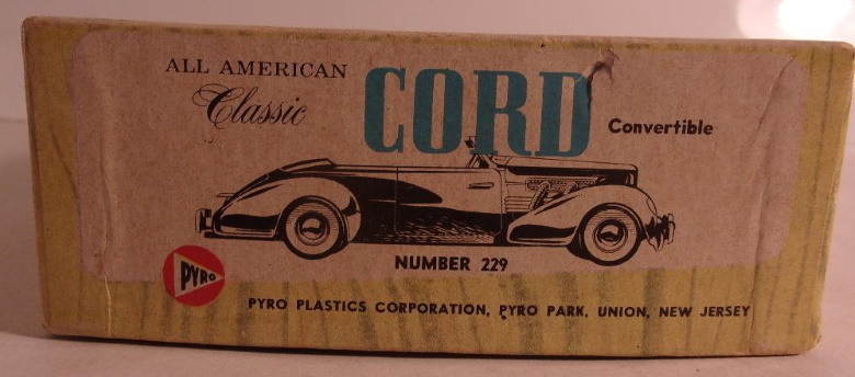 In the years immediately following WWII, classic cars were just old cars, and were a dime a dozen; meaning they could be purchased inexpensively as used cars. At the same time, scale models of antique and classic cars were coming into their own, and by the early fifties plastic, such as it was at the time, was supplanting wood as the material of choice for all types of scale models. In the year 1955, two Cords became available as plastic scale model assembly kits. Gowland & Gowland, by way of Revell, released a 1/32 scale 1936 Cord 810 convertible phaeton sedan, the model measured approximately 5 inches long. It represented a non supercharged car, thus lacking the external exhaust pipes we have become accustomed to seeing on many Cords of that era. [The external exhaust were on the supercharged cars, and that option arrived in 1937 on the Cord 812.] The raised convertible top was an integral part of the body so that was the model builders only option. The other Cord model kit released in 1955 was the '37 812 convertible phaeton sedan, listed as 1/24 scale, by Pyro Plastics Corp., of New Jersey. This model measured approximately 8 inches when assembled, and represented an open car, with the top down, a supercharged engine with external exhaust pipes, and an opening hood. Our focus here is the Pyro kit, and more specifically the intriguing box art of what is believed to be the first issue of the kit. First object of interest is the large illustration on the box top. It depicts an 812 convertible coupe; a car with no rear seat, a body style Cord called a Sportsman, yet the model contained within the box is is not a Sportsman, but the convertible with a rear seat, the Phaeton Sedan. Both ends of the box correctly depict the contained model, the Phaeton Sedan. Yet in an illustration on the side of the box, the Sportsman (convertible coupe) again erroneously appears. In the years since 1955 we have come to know that the other models in the Pyro "1/24 scale" series are the '35 Auburn 851 Speedster, and the '48 Lincoln Continental Cabriolet. Both of them are correctly depicted o the box sides, and both - like the Cord - have been reissued several times. Then it gets interesting. In addition to the Cord Sportsman, the Auburn and the Continental, there also appear on the sides of the box, illustrations of two cars which presumably were under consideration for production, but to the best of my knowledge, were never made: a '33 Pierce Arrow Silver Arrow sedan, and a Duesenberg J roadster. Both of which, I'm confident, would have been welcomed by many modelers. We are left to wonder why they were not made. Thus, the box art is actually more interesting in some ways, than the model it contained. The '37 Cord Convertible is the one Cord model most represented in both plastic kits, and assembled diecast metal models. Fortunately, other body styles and other years have since also become available in various scales and mediums, including resin conversion bodies, and fully assembled models. The Pyro kit from 1955, though not the best representation of the car, was indeed the first readily available scale model of the front wheel drive Cord, and with the box art of that first release, arguably also the most interesting. Box art: