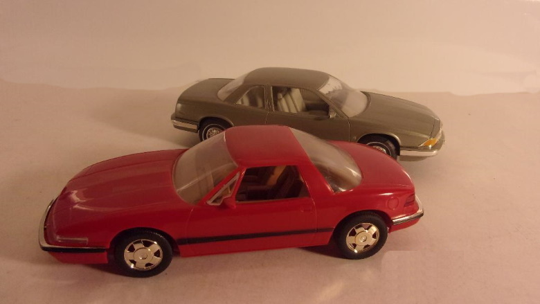 1988 Buick Regal and Reatta Coupe 1988 Buick, 1/24 scale, Regal and Reatta coupe by Product Dynamics Ltd., a company in Pennsylvania, which, prior to these Buicks I had not heard of, either in relation to promotional scale model cars, nor anything else for that matter. Neither the models, nor their colorful packages, mention the name of the company that made them, so they were somewhat of a mystery, or at least a curiosity, when they were released. I don't recall seeing or hearing any advance press on these models before they appeared. I will say that they were welcome surprises in the era of only Camaro and Corvette promotional models being made. The packages do not label the models as a specific year, and though they are most commonly considered 1988s, they are often listed as 1988 or 1989. The Regal is molded in a maroon metallic, with black A and B pillars, and a red interior, while the Reatta is a solid red, with a tan interior. (The regal pictured here has been repainted). One That Almost Was One fact that remains a mystery to me is why the pot metal promotional models, even within the same automotive manufacturer's product line, were made in so many different scales. National Products made Buick promos, some in various scales "around" 1/32, up to and including 1950. Apparently, no 1951 Buick model was made, but for '52 and '53 Banthrico offered Buicks closer to (but slightly smaller than) 1/25 scale, which by then had become the industry standard. The 1950 Buick Super pictured in the group photos is a plaster cast (partial) copy of a pot metal original, in the scale of approximately 1/33. The pot metal model was a decent replica of the '50 Buick...and the only one I had been aware of. Several years ago, at the Old Town Escorts model car show in Chicago, I happened upon a 1950 Buick resin body, with separate chrome bumpers and grille...in 1/25 scale. It was a Mil Buck model,being offered by the late Bill Buckingham, who was a well known model car collector. Eventually I learned it was joint endeavor of Mr. Buckingham and Dean Milano, hence the name Mil Buck. Dean Milano should be familiar to long time readers of the former Scale Auto Enthusiast Magazine, as he was a prolific and proficient replica stock model builder, who replicated many unusual vehicles of which there were no commercially produced models. Several of his conversions were featured in Scale Auto in the 1980s. Some may remember that for a time Dean also operated a toy museum. Unfortunately museums require steady income to continue operating. Unfortunately I didn't get to see the museum before it had to close, but it was most interesting to read about it and see the photos in a magazine article. Bill Buckingham, in addition to his vast model car collection, apparently had some connection to Banthrico Models, whether he was employed by them at some point, or "knew people", or perhaps both. The actual details are unknown to me, however, what I was told was that the 1/25 scale '50 Buick model being discussed here is a copy of one which was developed and considered for production by Banthrico, but never produced. The one which Banthrico did produce was the smaller scale one mentioned previously. Naturally I had to purchase the 1/25 scale Buick kit and build it.