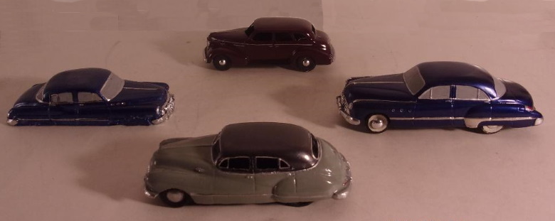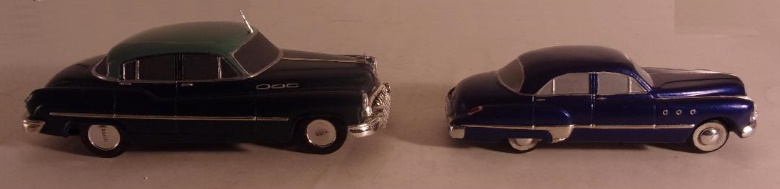 I am a fan of straight eight Buicks. Over their lifespan some were produced in displacements of 233, 248, 263, 320, and 344 cubic inches.The 233 and 344 were discontinued in the thirties, with the 248's final year being 1950, and the 320 marching on into 1952. In 1950 the 263 was introduced and in 1953 it became the last of Buick's straight eights, but only in the Special; other '53 models employed the new for '53 V8 of 322 cubic inch displacement - the first of the "nailheads". Since 1904, Buick made overhead valve engines, a design which they called "valve-in-head". The significance of this is that other auto manufacturers continued to produce flathead (side valve, or valve in block) engines into the mid 1950s, and beyond in some cases. While the OHV engine is superior to the flathead, the Buick straight eight design was not ideal, in that it had siamese ports. The intake and exhaust ports were on the same side of the engine, requiring some cylinders to share an intake runner (the Buick had four), while the exhaust had eight. It's common knowledge that a cross flow head is better for optimum performance, it is also more expensive to produce. Buicks also had only five main bearings. While I am unaware of this being a problem in any of the Buick in lines, some straight eights, Packard in particular, had nine main bearings. Stronger, theoretically better, but also heavier. In spite of the siamese ports not being the best design for performance, the Buick straight eights were not only dependable and reliable, but also innovative in other ways. For example, in 1938 Buick's then largest engine, the 320, was installed in their lightest car, thus creating the Buick Century, so named because it was capable of attaining 100 mph. In 1941 and '42, Buick offered "Dual Compound Carburetion"; two stromberg two barrel carburetors. The set up included a split exhaust manifold, each half drawing from four cylinders, but dumping into a single header pipe. Compound Carburetion was standard on some models, and optional on others. The 320 engine in the big cars was rated at 165 horsepower with the dual carbs. Cadillac in that same period had 150 hp from its flathead V8. WWII crashed the party, and the immediate postwar era saw mostly warmed over transportation to satisfy the car hungry populace, but it included some new makes and models as well. Kaiser was new, and Studebaker was radically restyled. Kaiser unfortunately didn't remain ten years, in spite of some unique and practical offerings. Studebaker continued to progress to an OHV V8 in 1951, and a knock-em-dead restyle in 1953. In the meantime, Buick was not asleep. In 1952 a Buick engineer named Braun gave us the four barrel carburetor, which appeared on the 320 straight eight. It was a year later, in 1953, that other manufacturers began to offer 4 barrel carburetors, and also in 1953 Buick offered their first modern V8, as previously mentioned. HOW THIS RELATES TO SCALE MODEL CARS I told you all that, so I could tell you this: National Products division of Banthrico Industries made the '49 Buick Super 4 door sedan promotional in 1/31 actual size in the medium of slush cast pot metal. In 1950 they made the Buick Super (model 51) 4 window, 4 door sedan (121.5" wheelbase) in 1/30 actual size. As mentioned elsewhere, They were apparently contemplating doing the '50 in a larger scale (See "One Hit Wonders" under "promo perspective"), but ultimately did not. 1951, for reasons unknown to me, saw no Buick scale model made, in any scale. In 1952 Banthrico produced the Buick 4 door six window sedan (125.6" wheelbase) in alleged 1/25 scale, which was becoming the standard model car industry scale. The model supposedly represented the Roadmaster, which was at that time, the top of the line Buick, with four simulated port holes on the front fender. The flaw in the operation being that the Roadmaster used the 320 cube straight eight, then Buick's longest engine, and thus the front clip of the model was too short to accurately represent the Roadmaster. It would, however, accurately represent the Super, which used the 263 in line eight.. So the Charcoal and gray '52 in the accompanying photos was altered by removing one of the fender "port holes", and thus more accurately representing the mid line Super. The maroon model in the photos, also began life as a '52 "Roadmaster", and was likewise changed by removing one "port hole", and further modified by altering the side chrome trim, and removing the rear fender chrome "fins", to resemble the '51 Buick Super, thereby resulting in a reasonably accurate replica of the "missing" year. The light blue and white model is a Banthrico '53 Buick, and somewhat accurately represents the 4 port hole Roadmaster, which would have used the then new 322 V8, which was obviously shorter in length than either straight eight...even though visibly the distance between the front edge of the front door, and the rear edge of the front wheel opening is still too short. All of this means nothing to most people, but it may mean something to some, so for that potential reason it was presented. Jim Amado We borrowed that term from the record industry, where it referred to a singer or a group that had one song that made it onto the charts,