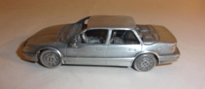 in the same scale. A few short years, later in 1991, GM contributed to their own bankruptcy by adding yet another car line to their repertoire when they foisted the Saturn upon the car buying public. They also offered promotional scale models of two Saturn models, again in pewter, and again in 1/36 scale. The suggested retail price for each was $89.95, and allegedly only 500 of each were made. Unfortunately, it is known that more than 500 were made. In my opinion, not only were they over priced, but they suffered miserably in detail. One thing that made Saturn four door sedans (and Oldsmobile clones) interesting was the wrap around back light, which is quite conspicuous in its absence in the pewter models.