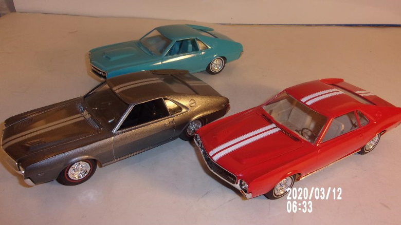The American Motors two passenger coupe, known as the AMX, was modeled by four different model companies back in the day…sort of. Actually, it was made by only three model companies, but marketed by four. When the car was first introduced in mid 1968, AMT offered a scale model kit in 1/25 scale, and MPC offered a kit in 1/20 scale. Interestingly, however, AMT did not produce the 1/25 scale model . JoHan did. It was felt that AMT was the better known company, so it was marketed by them. The AMT kit number was 2568. According to some sources, JoHan also made promotional models for the AMC dealers in 1968, with and without friction motors. JoHan made the ’69 in 1/25 scale, again marketed by AMT, under kit #T294. Promotional models were also offered by JoHan, for the AMC dealers. The ’69 AMX has been reissued by JoHan numerous times. In a kit, as one of their “USA Oldies” series, and as the “Drag-on Lady” Shirley & H.L. Shahan Super Stock drag racing car (kit # C3069), and yet again as the same (drag)car inaccurately labeled as a “Pro Street” car. This last version was essentially the “Drag-on Lady” kit, without the decals; it lacked the Pro Street characteristic narrowed rear end, and tubbed rear wheel wells. Revell, in 1/32 scale, kit # H1296, and AMT, in 1/43 scale, (various releases) also modeled the ’69 AMX, but here our focus is on the larger scale renditions. MPC offered two kits of the ’69 in 1/20 scale: kit #2002, was the stock version, and kit # 2004 was the “Yankee Clipper funny car drag version. The ’69 AMX has been recycled several times under the JoHan name as a “Promotional” model. The most recent releases were unfortunately inaccurate, in that they had 1970 interiors. Later releases of the drag car kit (#C3069) also included the incorrect interior. For 1970, AMT kit # Y722 was a 1/25 scale AMX, and MPC kit # 3170 was a 1/20 scale kit. Promotional models of the ’70 were done in 1/25 scale by JoHan. Here’s how to accurately identify each of the three years. Externally, the 68(1/2), and the ’69 are identical; the exterior of the ’70 differs in hood, grille, taillights, and rocker panel molding. The real key, however , is the seats. The ’68 bucket seats had low backrests, the ’69 had headrests, and the ’70 had highback (integrated headrests) bucket seats. The upholstery pattern was also different in the 1970. Unfortunately, though the name JoHan (actually a contraction of the name of the founder, John Hanley) remained, the company changed hands a few times in recent years, and things got a bit confused. The most recent releases of the AMX models, both the kits and the reissued promos, though intended and labeled as 1969s, had ’70 interiors with the high back bucket seats, and incorrect (for ’69) upholstery pattern.