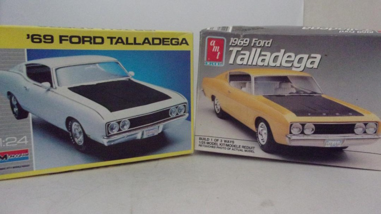 While most recognize that the Talladega was Ford's weapon in the NASCAR "Aero Wars", what follows are some facts that by now most may be aware of and /or familiar with, but for the few who may not, I present the 1969 Ford Torino Talladega "Twins". They are fraternal, and not identical, twins. In 1968, and again in 1969, AMT offered the Torino GT Sportsroof (fastback). Later AMT offered the '69 Torino Cobra. Then in 1990, AMT offered the 1969 Torino Talladega. Coincidentally, or perhaps intentionally, also in 1990, Monogram offered the 1969 Torino Talladega. There the similarity ends. The most obvious difference, instinctively known to serious model builders is that AMT produced in a scale of 1/25 actual size, while Monogram produced in the scale of 1/24 actual size. There are those among us who prefer one size over the other and/or one brand over the other, so they may automatically purchase their preference without realizing the differences between the two Talladegas is more than just the scale in which they were produced. The Monogram model, kit # 2912, represents the majority of the limited production Talladegas which Ford sold to the public. Those cars were offered in only three colors: Wimbledon white (as shown on the Monogram box cover), Royal Maroon, or Presidential Blue. Regardless of body color selected, all had black interiors, a bench seat in the front, and a column shifted C6 (automatic) transmission. The AMT model, kit #6889, depicts a yellow car on the box cover, and shows a white, bucket seat interior. The box art depicts an accurate, but one of a kind, '69 Talladega which was specially built exclusively for the (then) president of the Ford Motor Company, Semon "Bunkie" Knudsen. Bunkie's car was the only '69 Talladega to be so equipped: Yellow exterior, white interior with bucket seats and console, yet retaining the column shift for the automatic transmission. NOTE that the AMT kit has a 4 speed manual transmission attached to the engine. Fine if one wants to build a NASCAR or muscle car street version, but inaccurate for "Bunkie's car" which the box art represents. Thus, for any who may seek to do so, the two different models would allow the accurate assembly of legitimate variations, each with historical accuracy.